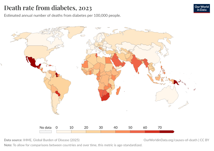 IHME, Global Burden of Disease (2024) – with minor processing by Our World in Data. “Death rate from diabetes” [dataset]. IHME, Global Burden of Disease, “Global Burden of Disease - Deaths and DALYs” [original data]. Retrieved September 17, 2025 from https://search-refactor-react-query.owid.pages.dev/grapher/death-rate-from-diabetes