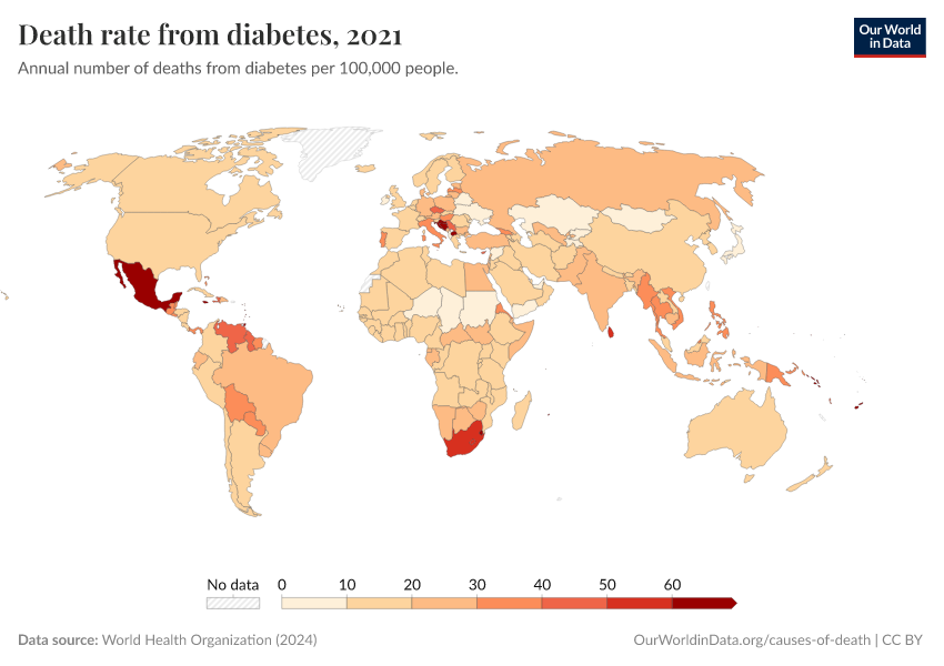 World Health Organization (2024) – with major processing by Our World in Data. “Death rate from diabetes” [dataset]. World Health Organization, “Global Health Estimates” [original data]. Retrieved September 17, 2025 from https://search-refactor-react-query.owid.pages.dev/grapher/death-rate-from-diabetes-ghe