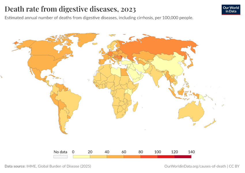 “Data Page: Death rate from digestive diseases”, part of the following publication: Esteban Ortiz-Ospina and Max Roser (2016) - “Global Health”. Data adapted from IHME, Global Burden of Disease. Retrieved from https://search-refactor-react-query.owid.pages.dev/grapher/death-rate-from-digestive-diseases-gbd [online resource]How to cite this data