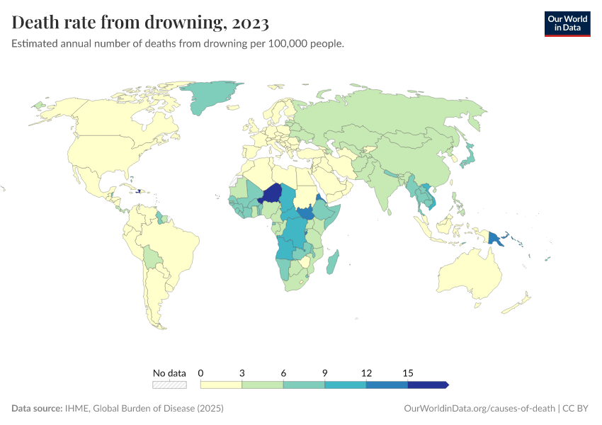 IHME, Global Burden of Disease (2024) – with minor processing by Our World in Data. “Death rate from drowning” [dataset]. IHME, Global Burden of Disease, “Global Burden of Disease - Deaths and DALYs” [original data]. Retrieved September 17, 2025 from https://search-refactor-react-query.owid.pages.dev/grapher/death-rate-from-drowning