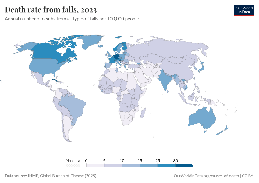 “Data Page: Death rate from falls”, part of the following publication: Esteban Ortiz-Ospina and Max Roser (2016) - “Global Health”. Data adapted from IHME, Global Burden of Disease. Retrieved from https://search-refactor-react-query.owid.pages.dev/grapher/death-rate-from-falls-gbd-rate [online resource]How to cite this data