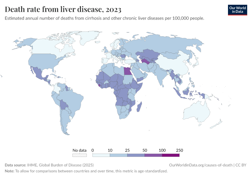 IHME, Global Burden of Disease (2024) – with minor processing by Our World in Data. “Death rate from liver disease” [dataset]. IHME, Global Burden of Disease, “Global Burden of Disease - Deaths and DALYs” [original data]. Retrieved September 17, 2025 from https://search-refactor-react-query.owid.pages.dev/grapher/death-rate-from-liver-disease