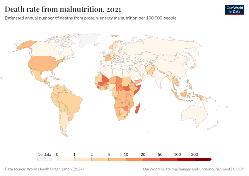 World Health Organization (2024) – with major processing by Our World in Data. “Death rate from malnutrition” [dataset]. World Health Organization, “Global Health Estimates” [original data]. Retrieved September 17, 2025 from https://search-refactor-react-query.owid.pages.dev/grapher/death-rate-from-malnutrition-ghe