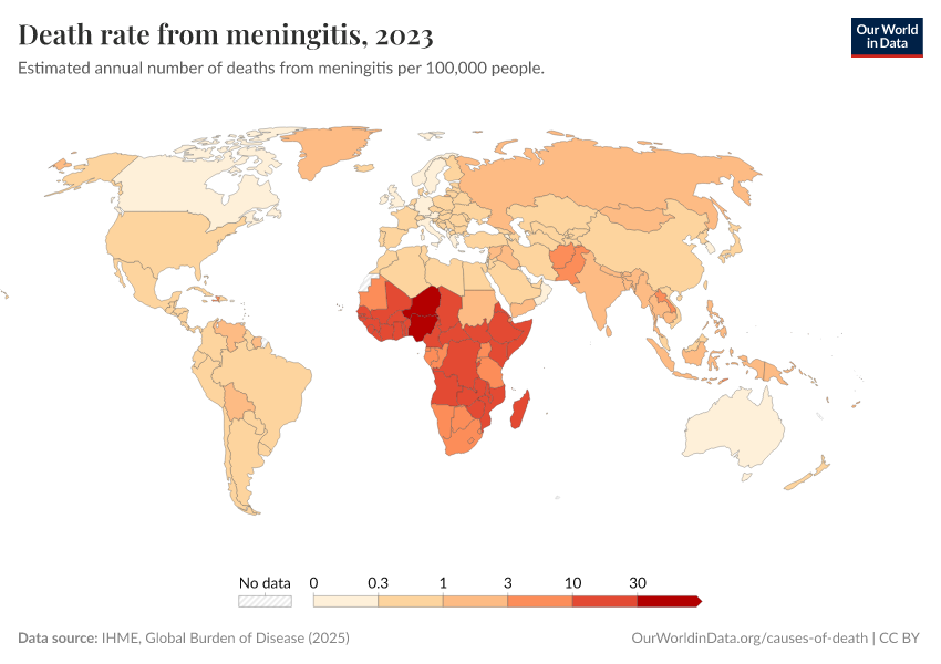 IHME, Global Burden of Disease (2024) – with minor processing by Our World in Data. “Death rate from meningitis” [dataset]. IHME, Global Burden of Disease, “Global Burden of Disease - Deaths and DALYs” [original data]. Retrieved September 17, 2025 from https://search-refactor-react-query.owid.pages.dev/grapher/death-rate-from-meningitis-gbd