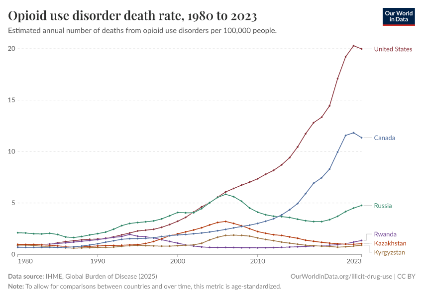 IHME, Global Burden of Disease (2024) – with minor processing by Our World in Data. “Opioid use disorder death rate” [dataset]. IHME, Global Burden of Disease, “Global Burden of Disease - Deaths and DALYs” [original data]. Retrieved September 17, 2025 from https://search-refactor-react-query.owid.pages.dev/grapher/death-rate-from-opioid-use