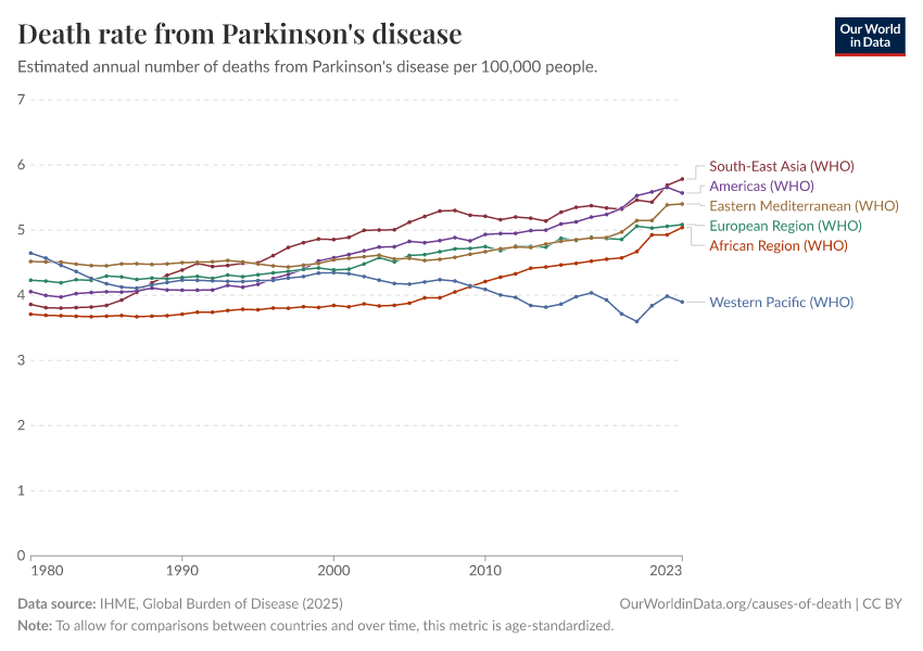 IHME, Global Burden of Disease (2024) – with minor processing by Our World in Data. “Death rate from Parkinson's disease” [dataset]. IHME, Global Burden of Disease, “Global Burden of Disease - Deaths and DALYs” [original data]. Retrieved September 17, 2025 from https://search-refactor-react-query.owid.pages.dev/grapher/death-rate-from-parkinsons-disease