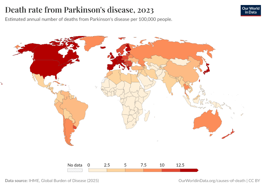 IHME, Global Burden of Disease (2024) – with minor processing by Our World in Data. “Death rate from Parkinson's disease” [dataset]. IHME, Global Burden of Disease, “Global Burden of Disease - Deaths and DALYs” [original data]. Retrieved September 17, 2025 from https://search-refactor-react-query.owid.pages.dev/grapher/death-rate-from-parkinsons-disease-gbd