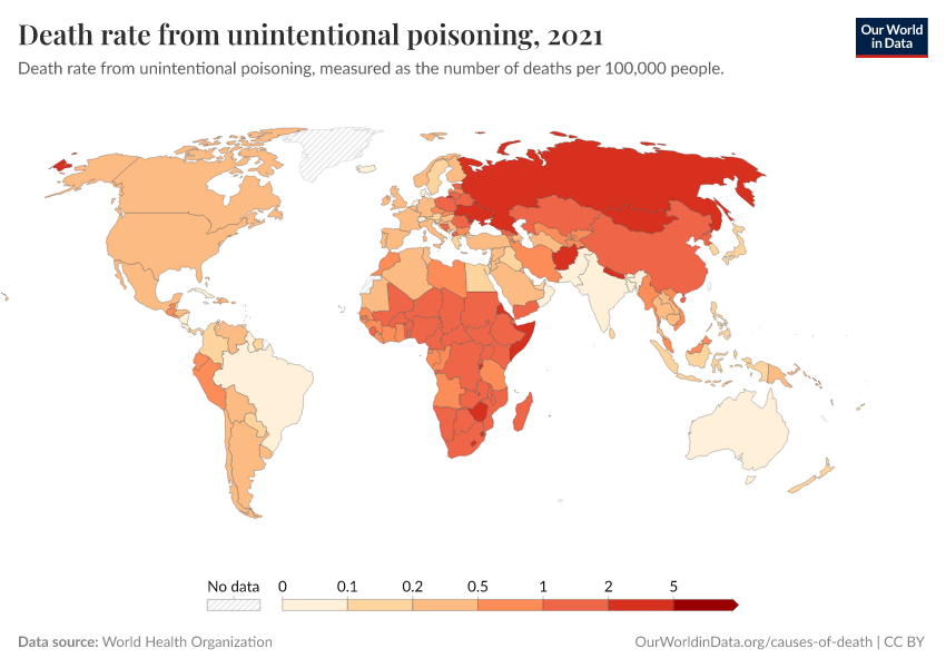 “Data Page: Death rate from unintentional poisoning”. Our World in Data (2025). Data adapted from World Health Organization. Retrieved from https://search-refactor-react-query.owid.pages.dev/grapher/death-rate-from-poisonings [online resource]How to cite this data