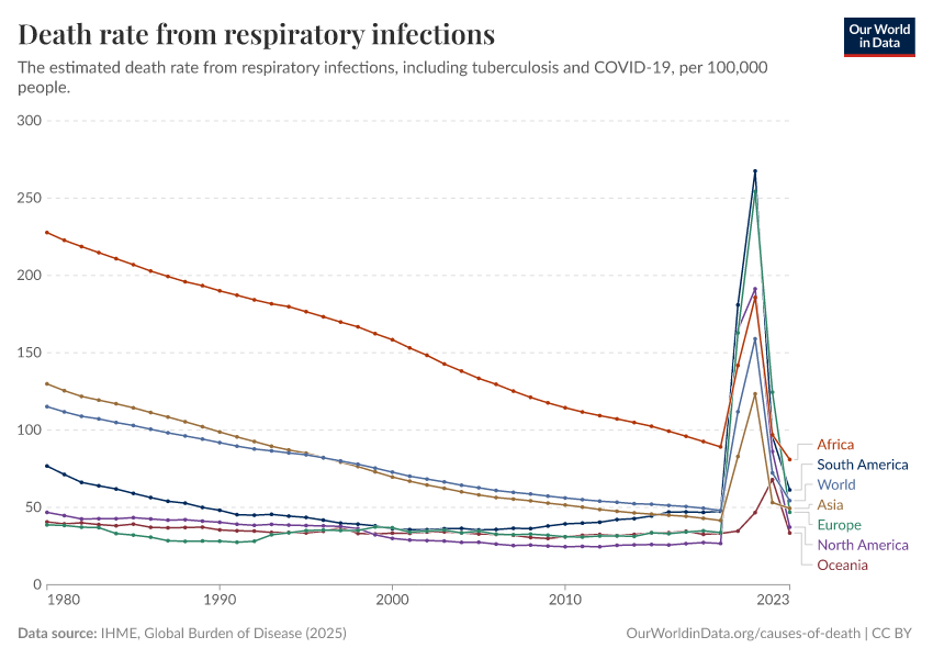 IHME, Global Burden of Disease (2024) – with minor processing by Our World in Data. “Death rate from respiratory infections” [dataset]. IHME, Global Burden of Disease, “Global Burden of Disease - Deaths and DALYs” [original data]. Retrieved September 17, 2025 from https://search-refactor-react-query.owid.pages.dev/grapher/death-rate-from-respiratory-infections-gbd