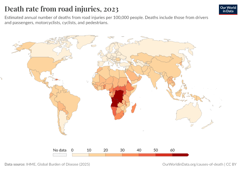 IHME, Global Burden of Disease (2024) – with minor processing by Our World in Data. “Death rate from road injuries” [dataset]. IHME, Global Burden of Disease, “Global Burden of Disease - Deaths and DALYs” [original data]. Retrieved September 17, 2025 from https://search-refactor-react-query.owid.pages.dev/grapher/death-rate-from-road-accidents