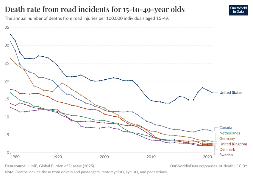 IHME, Global Burden of Disease (2024) – with minor processing by Our World in Data. “Death rate from road incidents for 15-to-49-year olds” [dataset]. IHME, Global Burden of Disease, “Global Burden of Disease - Deaths and DALYs” [original data]. Retrieved September 17, 2025 from https://search-refactor-react-query.owid.pages.dev/grapher/death-rate-from-road-accidents-for-15--to-49-year-olds