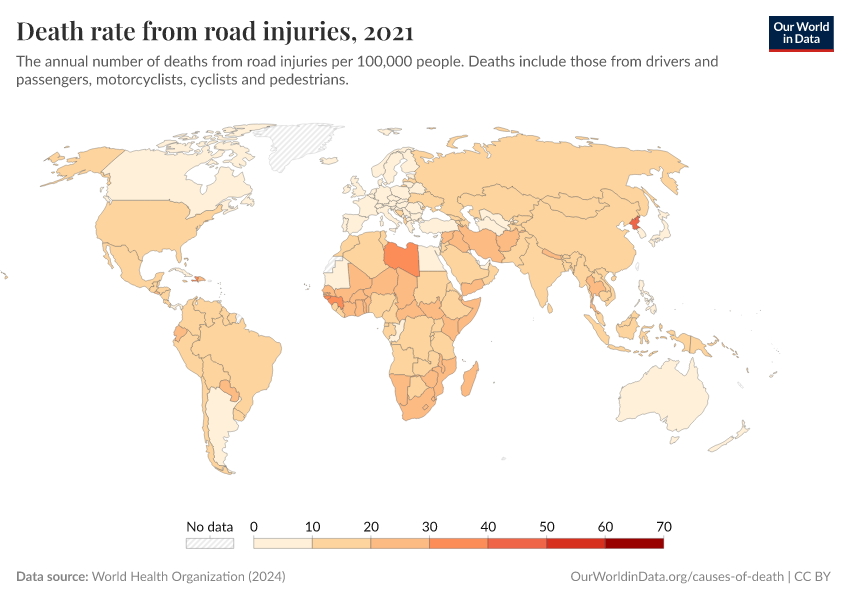World Health Organization (2024) – with major processing by Our World in Data. “Death rate from road injuries” [dataset]. World Health Organization, “Global Health Estimates” [original data]. Retrieved September 17, 2025 from https://search-refactor-react-query.owid.pages.dev/grapher/death-rate-from-road-accidents-ghe