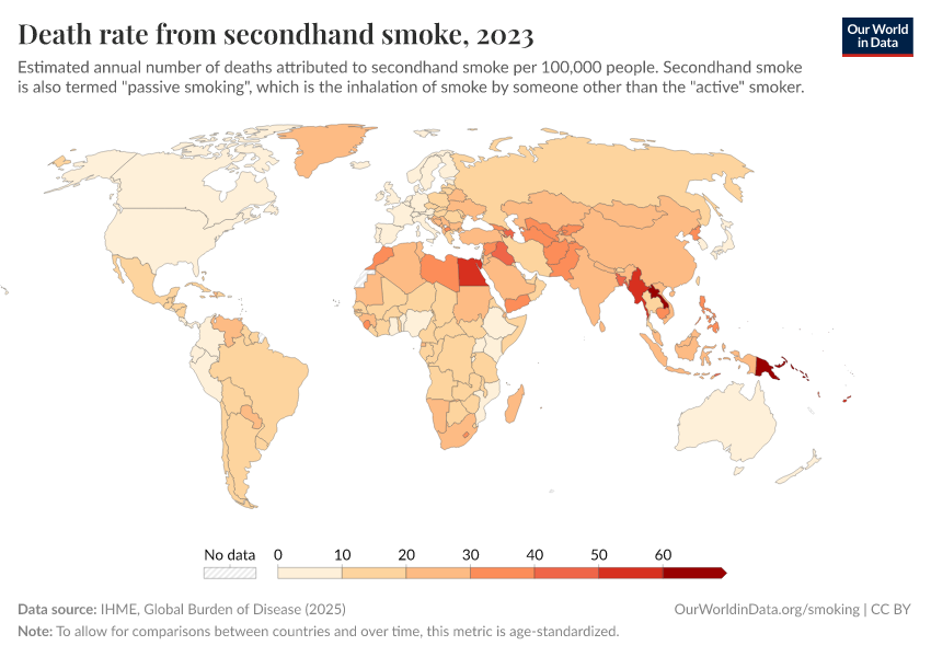 IHME, Global Burden of Disease (2024) – with minor processing by Our World in Data. “Death rate from secondhand smoke” [dataset]. IHME, Global Burden of Disease, “Global Burden of Disease - Risk Factors” [original data]. Retrieved September 17, 2025 from https://search-refactor-react-query.owid.pages.dev/grapher/death-rate-from-secondhand-smoke