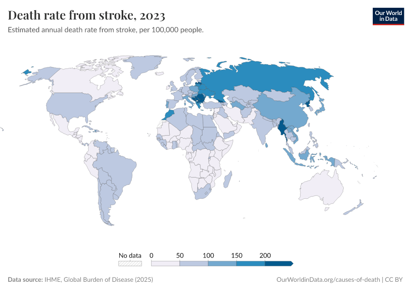 IHME, Global Burden of Disease (2024) – with minor processing by Our World in Data. “Death rate from stroke” [dataset]. IHME, Global Burden of Disease, “Global Burden of Disease - Deaths and DALYs” [original data]. Retrieved September 17, 2025 from https://search-refactor-react-query.owid.pages.dev/grapher/death-rate-from-strokes