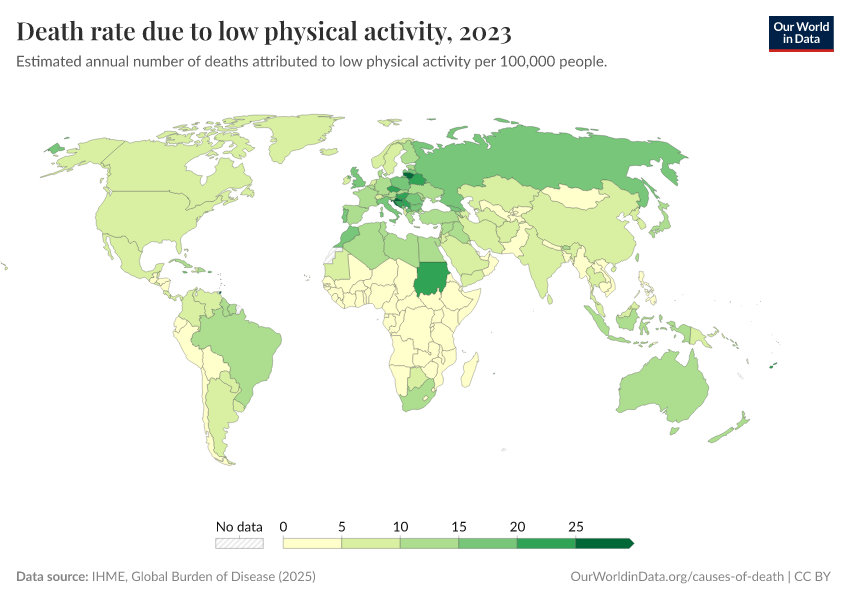 IHME, Global Burden of Disease (2024) – with minor processing by Our World in Data. “Death rate due to low physical activity” [dataset]. IHME, Global Burden of Disease, “Global Burden of Disease - Risk Factors” [original data]. Retrieved September 17, 2025 from https://search-refactor-react-query.owid.pages.dev/grapher/death-rates-due-to-low-physical-activity-gbd