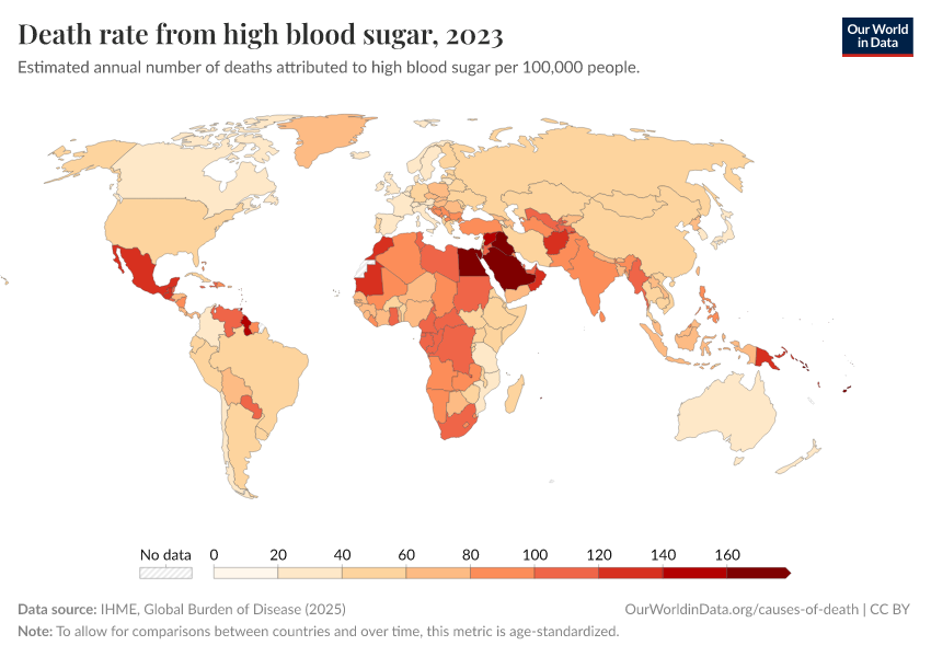 IHME, Global Burden of Disease (2024) – with minor processing by Our World in Data. “Death rate from high blood sugar” [dataset]. IHME, Global Burden of Disease, “Global Burden of Disease - Risk Factors” [original data]. Retrieved September 17, 2025 from https://search-refactor-react-query.owid.pages.dev/grapher/death-rates-from-high-blood-sugar