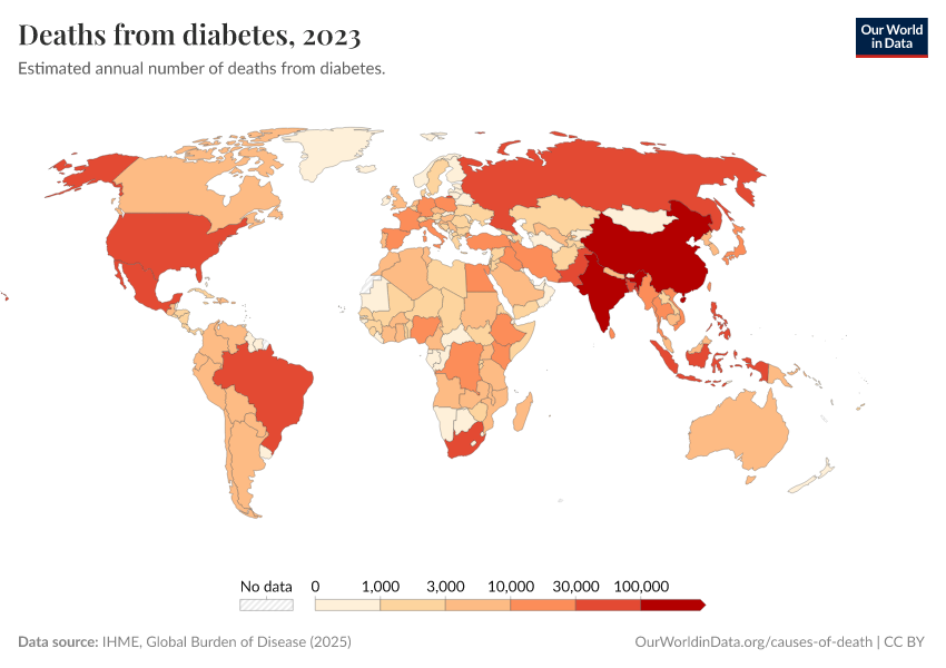 “Data Page: Deaths from diabetes”, part of the following publication: Esteban Ortiz-Ospina and Max Roser (2016) - “Global Health”. Data adapted from IHME, Global Burden of Disease. Retrieved from https://search-refactor-react-query.owid.pages.dev/grapher/deaths-from-diabetes [online resource]How to cite this data