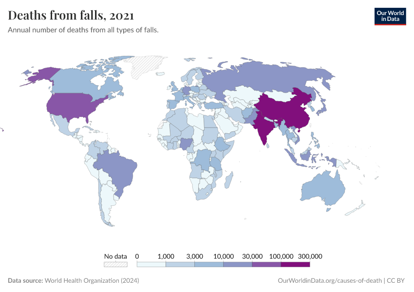 World Health Organization (2024) – with major processing by Our World in Data. “Deaths from falls” [dataset]. World Health Organization, “Global Health Estimates” [original data]. Retrieved September 17, 2025 from https://search-refactor-react-query.owid.pages.dev/grapher/deaths-from-falls