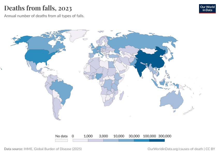 IHME, Global Burden of Disease (2024) – with minor processing by Our World in Data. “Deaths from falls” [dataset]. IHME, Global Burden of Disease, “Global Burden of Disease - Deaths and DALYs” [original data]. Retrieved September 17, 2025 from https://search-refactor-react-query.owid.pages.dev/grapher/deaths-from-falls-gbd