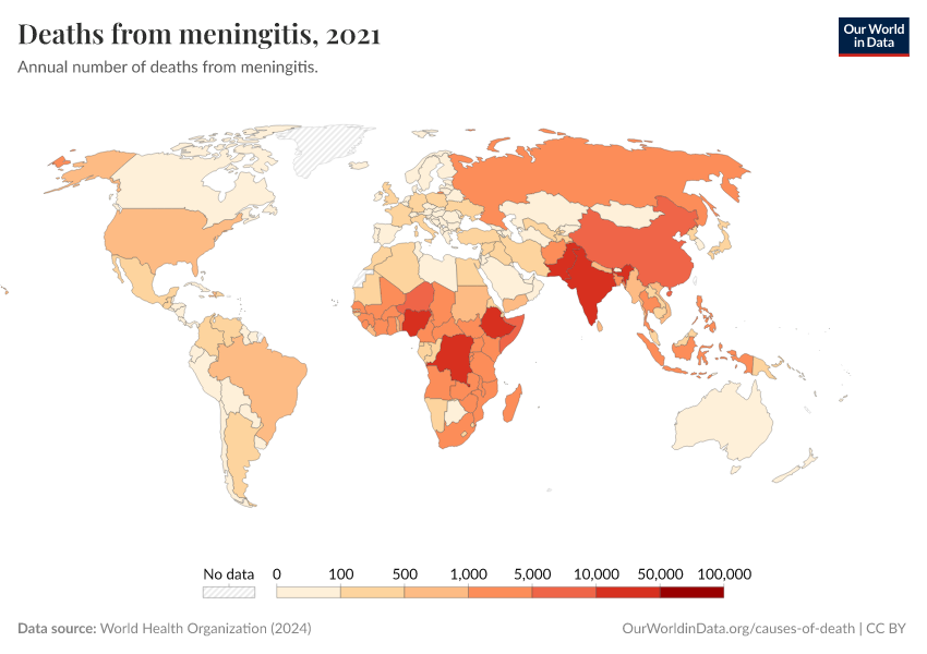 World Health Organization (2024) – with major processing by Our World in Data. “Deaths from meningitis” [dataset]. World Health Organization, “Global Health Estimates” [original data]. Retrieved September 17, 2025 from https://search-refactor-react-query.owid.pages.dev/grapher/deaths-from-meningitis-ghe