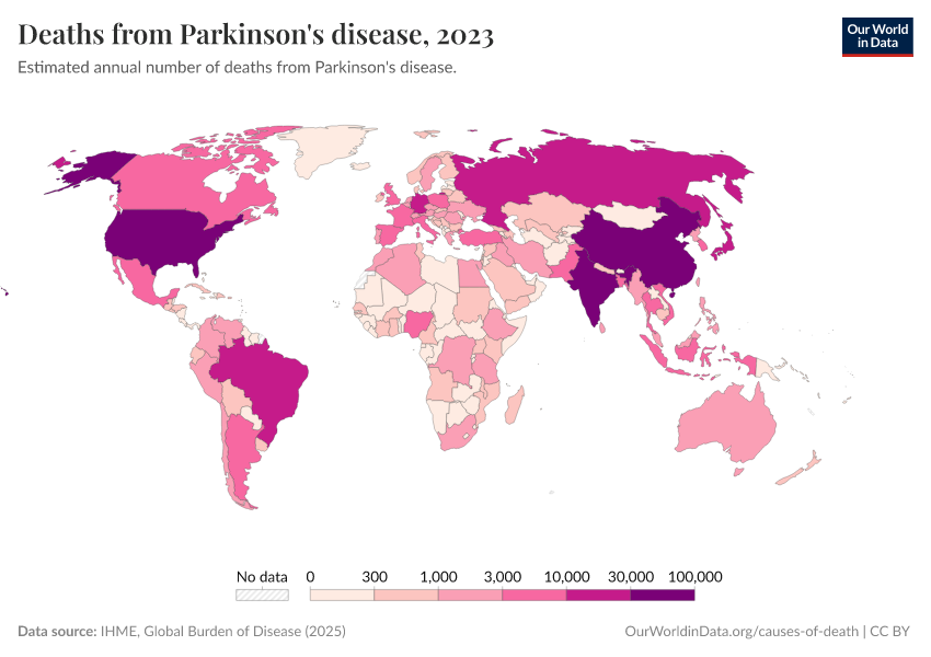 IHME, Global Burden of Disease (2024) – with minor processing by Our World in Data. “Deaths from Parkinson's disease” [dataset]. IHME, Global Burden of Disease, “Global Burden of Disease - Deaths and DALYs” [original data]. Retrieved September 17, 2025 from https://search-refactor-react-query.owid.pages.dev/grapher/deaths-from-parkinsons-disease