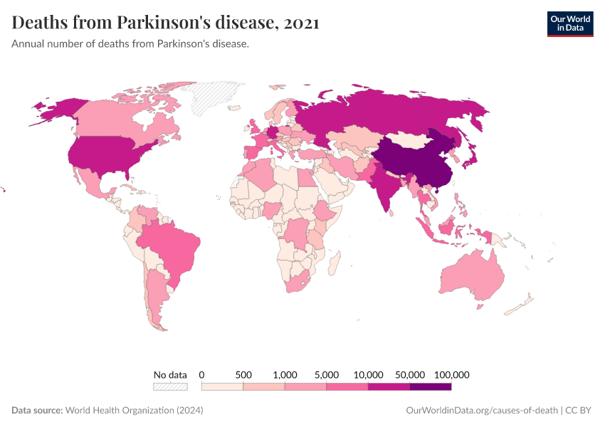World Health Organization (2024) – with major processing by Our World in Data. “Deaths from Parkinson's disease” [dataset]. World Health Organization, “Global Health Estimates” [original data]. Retrieved September 17, 2025 from https://search-refactor-react-query.owid.pages.dev/grapher/deaths-from-parkinsons-disease-ghe