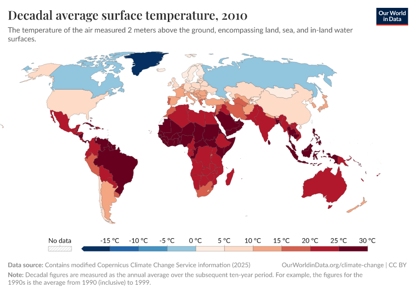 Contains modified Copernicus Climate Change Service information (2025) – with major processing by Our World in Data. “Decadal average surface temperature” [dataset]. Contains modified Copernicus Climate Change Service information, “ERA5 monthly averaged data on single levels from 1940 to present 2” [original data]. Retrieved September 17, 2025 from https://search-refactor-react-query.owid.pages.dev/grapher/decadal-average-surface-temperature