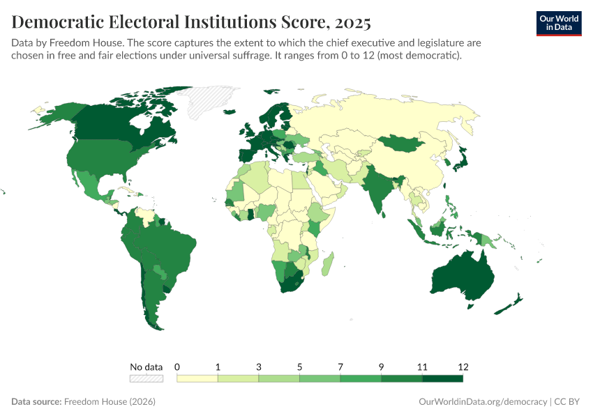 Freedom House (2024) – processed by Our World in Data. “Democratic electoral institutions” [dataset]. Freedom House, “Freedom in the World” [original data]. Retrieved September 17, 2025 from https://search-refactor-react-query.owid.pages.dev/grapher/democratic-electoral-institutions-fh