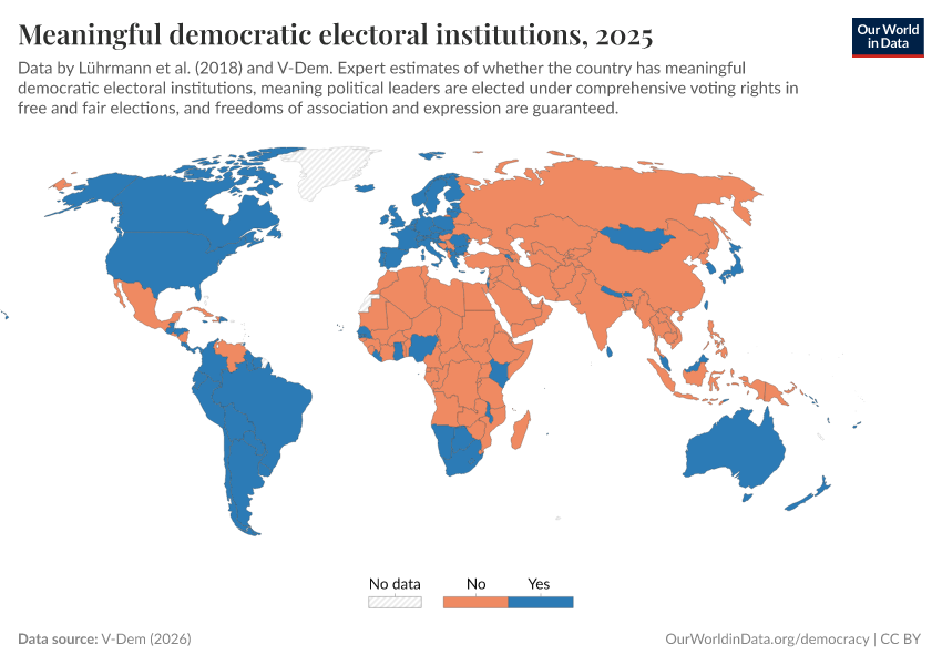 V-Dem (2025) – processed by Our World in Data. “Electoral democracy – V-Dem” [dataset]. V-Dem, “Democracy report v15” [original data]. Retrieved September 17, 2025 from https://search-refactor-react-query.owid.pages.dev/grapher/democratic-electoral-institutions-row
