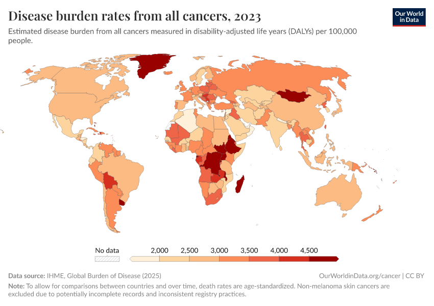 IHME, Global Burden of Disease (2024) – with minor processing by Our World in Data. “Disease burden rates from all cancers” [dataset]. IHME, Global Burden of Disease, “Global Burden of Disease - Deaths and DALYs” [original data]. Retrieved September 17, 2025 from https://search-refactor-react-query.owid.pages.dev/grapher/disease-burden-rates-from-cancers