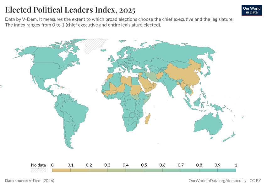 V-Dem (2025) – processed by Our World in Data. “Elected officials index – ” [dataset]. V-Dem, “Democracy report v15” [original data]. Retrieved September 17, 2025 from https://search-refactor-react-query.owid.pages.dev/grapher/elected-political-leaders-index