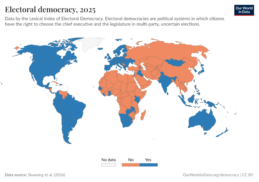 Skaaning et al. (2023) – processed by Our World in Data. “Electoral democracy” [dataset]. Skaaning et al., “Lexical Index of Electoral Democracy (LIED) v6.5” [original data]. Retrieved September 17, 2025 from https://search-refactor-react-query.owid.pages.dev/grapher/electoral-democracy-lexical