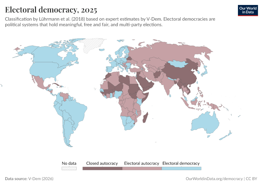 “Data Page: Political regime”, part of the following publication: Bastian Herre, Lucas Rodés-Guirao, and Esteban Ortiz-Ospina (2013) - “Democracy”. Data adapted from V-Dem. Retrieved from https://search-refactor-react-query.owid.pages.dev/grapher/electoral-democracy-row [online resource]How to cite this data