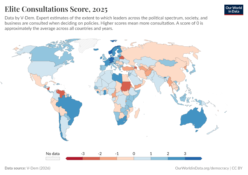 V-Dem (2025) – processed by Our World in Data. “Elite consultation – (central estimate)” [dataset]. V-Dem, “Democracy report v15” [original data]. Retrieved September 17, 2025 from https://search-refactor-react-query.owid.pages.dev/grapher/elite-consultations-score