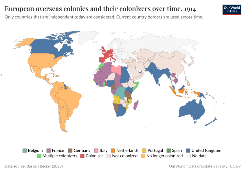 “Data Page: European overseas colonies and their colonizers over time”, part of the following publication: Bastian Herre and Pablo Arriagada (2023) - “State Capacity”. Data adapted from Bastian Becker. Retrieved from https://search-refactor-react-query.owid.pages.dev/grapher/european-overseas-colonies-and-their-colonizers [online resource]How to cite this data