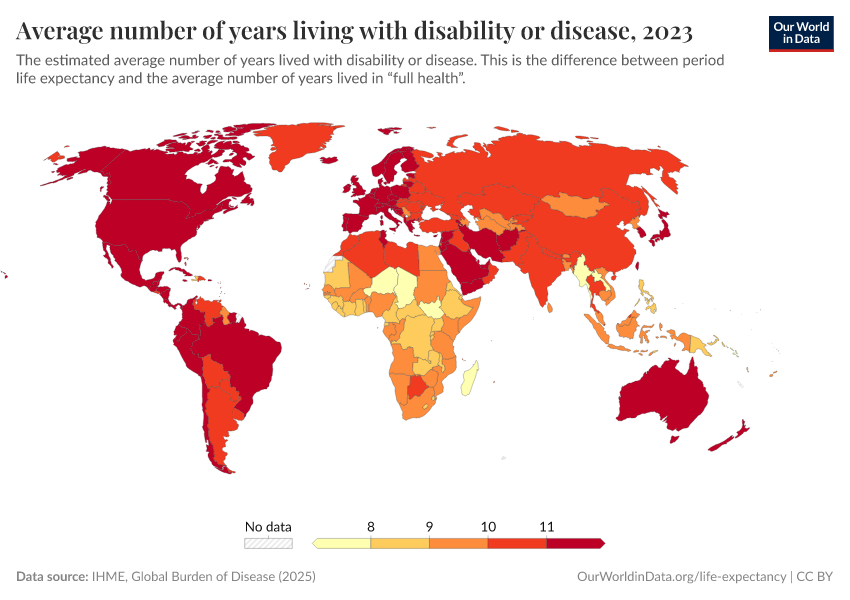 “Data Page: Average number of years living with disability or disease”, part of the following publication: Saloni Dattani, Lucas Rodés-Guirao, Hannah Ritchie, Esteban Ortiz-Ospina, and Max Roser (2023) - “Life Expectancy”. Data adapted from IHME, Global Burden of Disease. Retrieved from https://search-refactor-react-query.owid.pages.dev/grapher/expected-years-of-living-with-disability-or-disease-burden [online resource]How to cite this data