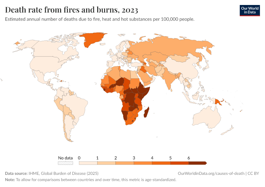 IHME, Global Burden of Disease (2024) – with minor processing by Our World in Data. “Death rate from fires and burns” [dataset]. IHME, Global Burden of Disease, “Global Burden of Disease - Deaths and DALYs” [original data]. Retrieved September 17, 2025 from https://search-refactor-react-query.owid.pages.dev/grapher/fire-death-rates