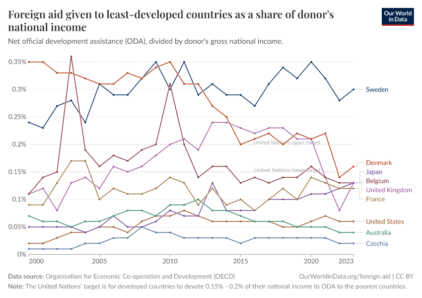 Organisation for Economic Co-operation and Development – processed by Our World in Data. “Foreign aid given to least-developed countries as a share of donor's national income” [dataset]. Organisation for Economic Co-operation and Development, “The Organisation for Economic Co-operation and Development (OECD).” [original data]. Retrieved September 17, 2025 from https://search-refactor-react-query.owid.pages.dev/grapher/foreign-aid-given-to-least-developed-countries-as-a-share-of-donors-national-income