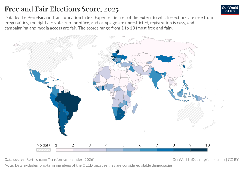 Bertelsmann Transformation Index (2024) – processed by Our World in Data. “Free and fair elections score” [dataset]. Bertelsmann Transformation Index, “Bertelsmann Transformation Index, Scores” [original data]. Retrieved September 17, 2025 from https://search-refactor-react-query.owid.pages.dev/grapher/free-fair-elections-bti
