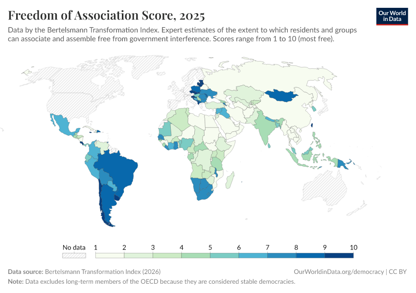 Bertelsmann Transformation Index (2024) – processed by Our World in Data. “Freedom of association score” [dataset]. Bertelsmann Transformation Index, “Bertelsmann Transformation Index, Scores” [original data]. Retrieved September 17, 2025 from https://search-refactor-react-query.owid.pages.dev/grapher/freedom-of-association-score-bti