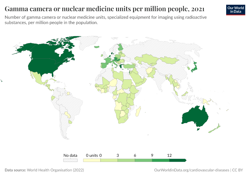 World Health Organisation (2022) – with minor processing by Our World in Data. “Gamma camera or nuclear medicine units per million people” [dataset]. World Health Organisation, “Global atlas of medical devices” [original data]. Retrieved September 17, 2025 from https://search-refactor-react-query.owid.pages.dev/grapher/gamma-camera-or-nuclear-medicine-availability