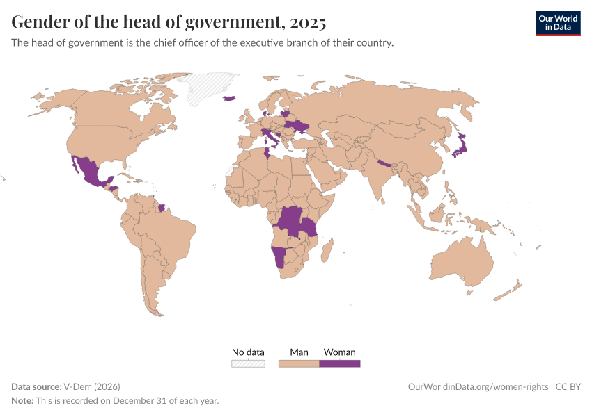 V-Dem (2025) – processed by Our World in Data. “Gender of the head of government” [dataset]. V-Dem, “Democracy report v15” [original data]. Retrieved September 17, 2025 from https://search-refactor-react-query.owid.pages.dev/grapher/gender-of-the-head-of-government