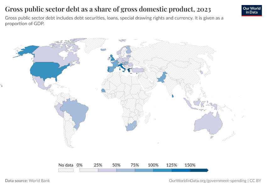 “Data Page: Gross public sector debt as a share of gross domestic product”. Our World in Data (2025). Data adapted from World Bank. Retrieved from https://search-refactor-react-query.owid.pages.dev/grapher/gross-public-sector-debt-as-a-proportion-of-gdp [online resource]How to cite this data