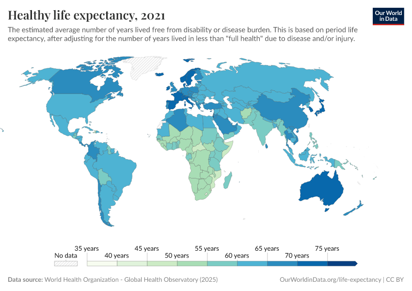“Data Page: Healthy life expectancy”. Our World in Data (2025). Data adapted from World Health Organization. Retrieved from https://search-refactor-react-query.owid.pages.dev/grapher/healthy-life-expectancy-at-birth [online resource]How to cite this data