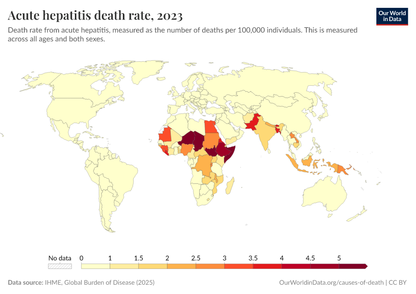 IHME, Global Burden of Disease (2024) – with minor processing by Our World in Data. “Acute hepatitis death rate” [dataset]. IHME, Global Burden of Disease, “Global Burden of Disease - Deaths and DALYs” [original data]. Retrieved September 17, 2025 from https://search-refactor-react-query.owid.pages.dev/grapher/hepatitis-death-rate