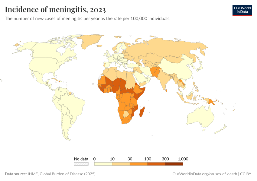 “Data Page: Incidence of meningitis”, part of the following publication: Esteban Ortiz-Ospina and Max Roser (2016) - “Global Health”. Data adapted from IHME, Global Burden of Disease. Retrieved from https://search-refactor-react-query.owid.pages.dev/grapher/incidence-of-meningitis [online resource]How to cite this data