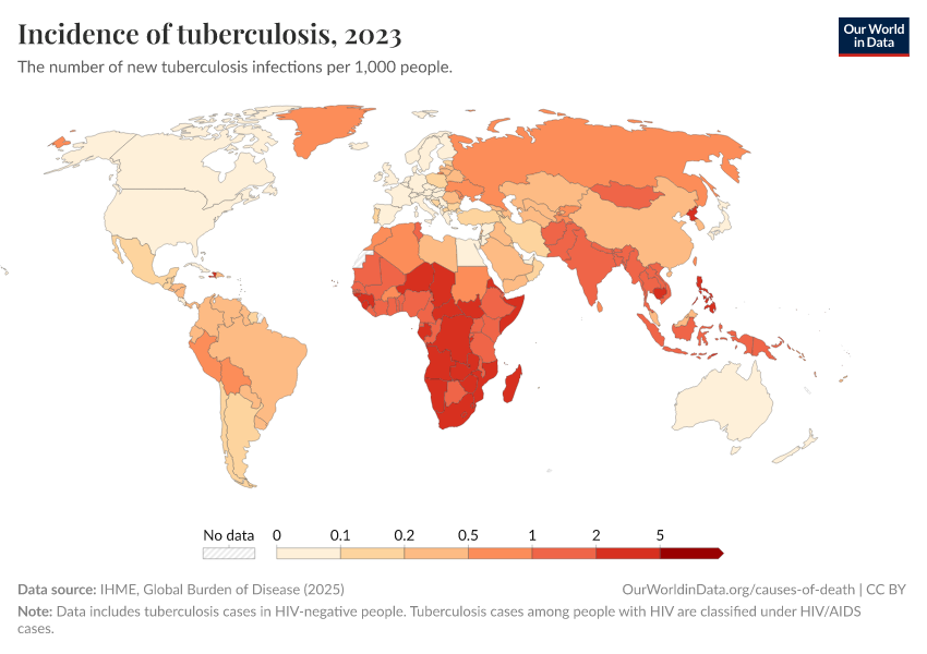 “Data Page: Incidence of tuberculosis”, part of the following publication: Esteban Ortiz-Ospina and Max Roser (2016) - “Global Health”. Data adapted from IHME, Global Burden of Disease. Retrieved from https://search-refactor-react-query.owid.pages.dev/grapher/incidence-of-tuberculosis [online resource]How to cite this data