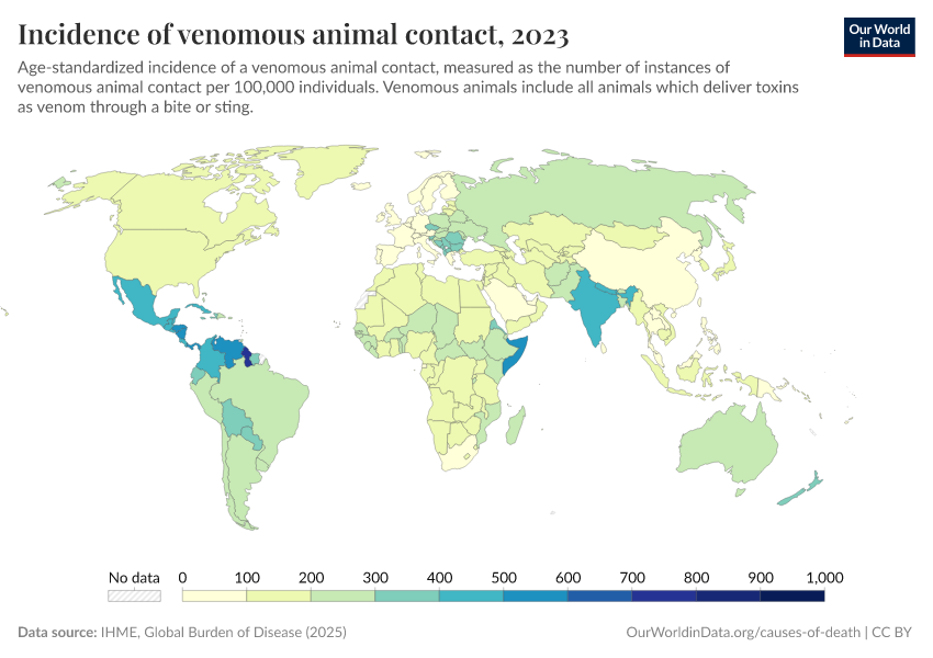 IHME, Global Burden of Disease (2024) – with major processing by Our World in Data. “Incidence of venomous animal contact” [dataset]. IHME, Global Burden of Disease, “Global Burden of Disease - Prevalence and Incidence” [original data]. Retrieved September 17, 2025 from https://search-refactor-react-query.owid.pages.dev/grapher/incidence-of-venomous-animal-contact