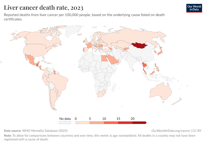 WHO Mortality Database (2024) – with minor processing by Our World in Data. “Liver cancer death rate” [dataset]. WHO Mortality Database, “WHO Mortality Database” [original data]. Retrieved September 17, 2025 from https://search-refactor-react-query.owid.pages.dev/grapher/liver-cancer-death-rate