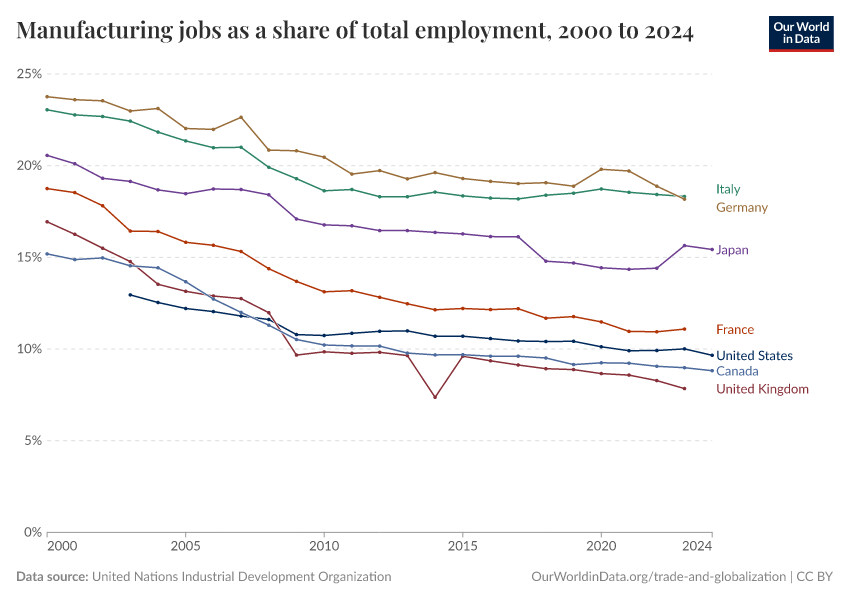 United Nations Industrial Development Organization and International Labour Organization – processed by Our World in Data. “Manufacturing jobs as a share of total employment” [dataset]. United Nations Industrial Development Organization and International Labour Organization, “Data from multiple sources” [original data]. Retrieved September 17, 2025 from https://search-refactor-react-query.owid.pages.dev/grapher/manufacturing-share-of-total-employment